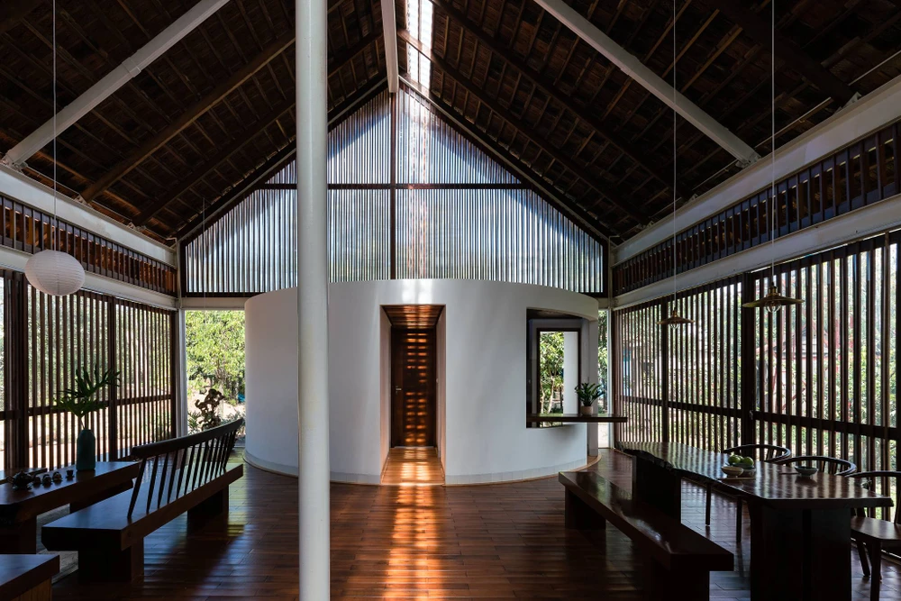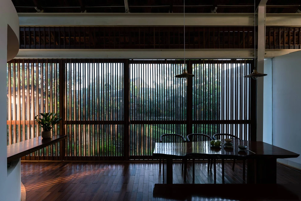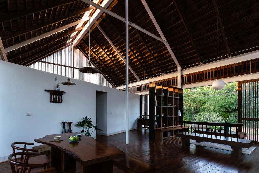 Khe sáng đỉnh mái trải dài theo phương ngang từ hướng tây bắc qua đông nam như một bức rèm ánh sáng hình thành nên vùng không gian ước lệ cho phòng ăn và phòng khách.