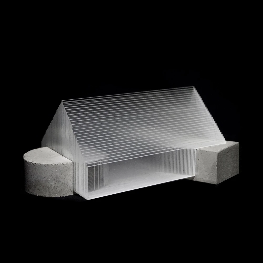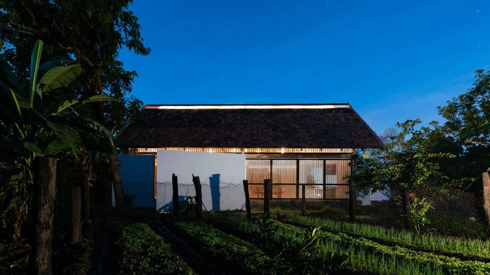 Cấy vào dưới mái hai khối chức năng riêng tư nằm ở hai đầu hồi, một bên là bếp, vệ sinh và bên còn lại là hai phòng ngủ. Hai khối chức năng này như hai bức tường kết hợp với sàn, mái và hệ cửa lùa mặt đứng hình thành nên vùng không gian chung nằm ở trọng tâm ngôi nhà.