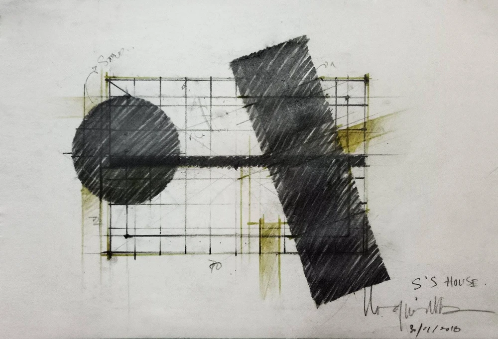 Từ đó, nhóm KTS Hồ Quốc Dân (Rear studio) và KTS Lê Hoàng Hiếu (AHO design studio) cùng đề xuất với chủ nhà hình thành một hệ mái trải dài theo phương ngang khu đất, hình thành vùng tiện nghi dưới mái cho các chức năng của ngôi nhà. Với cấu trúc cơ bản để đáp ứng kỹ thuật thi công và rút ngắn thời gian xây dựng, hệ kết cấu thép chịu lực đóng vai trò nâng đỡ mái, mái công trình như trôi nổi trong tự nhiên.