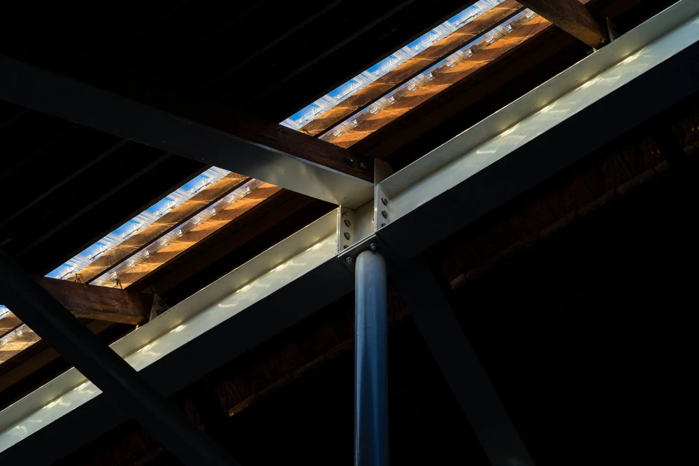 Nhóm KTS kết hợp khung thép thay vì sử dụng khung tre hỗ trợ cho phần mái nhà.