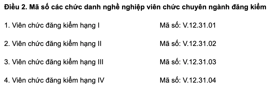 Thông tư cũng quy định viên chức đăng kiểm có bốn hạng viên chức. Mỗi hạng viên chức đăng kiểm sẽ đòi hỏi tiêu chuẩn về năng lực chuyên môn, nghiệp vụ, trình độ đào tạo, bồi dưỡng và nhiệm vụ khác nhau.