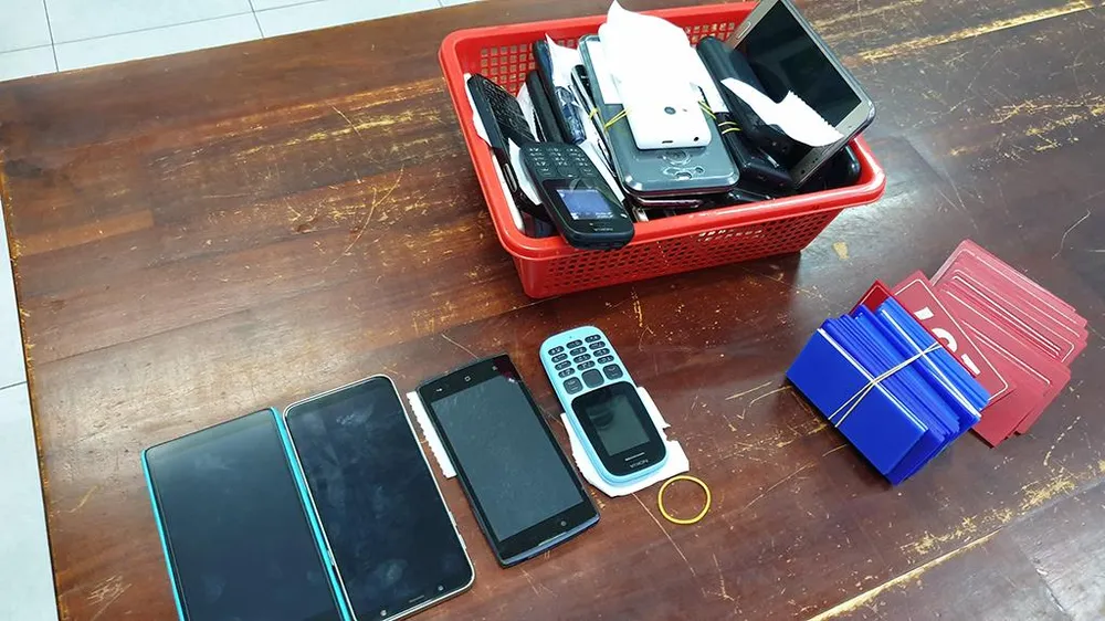 Tang vật thu giữ gồm nhiều điện thoại và thẻ nhựa để còn bạc đặt cược. Ảnh NT.