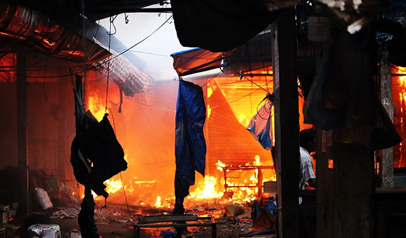 Hàng trăm tiểu thương cùng người dân địa phương nỗ lực dập lửa nhưng không có kết quả, lửa ngùn ngụt lan ra nhiều gian hàng, khói bốc đen mù mịt, thành cột lớn.
