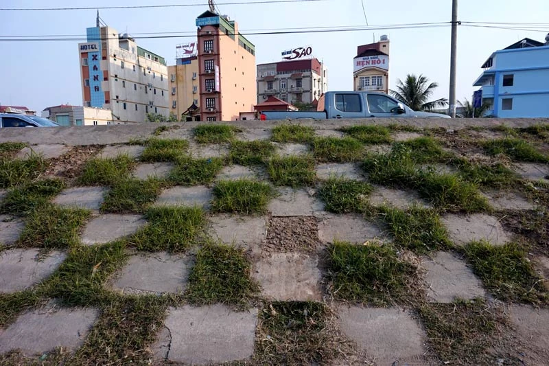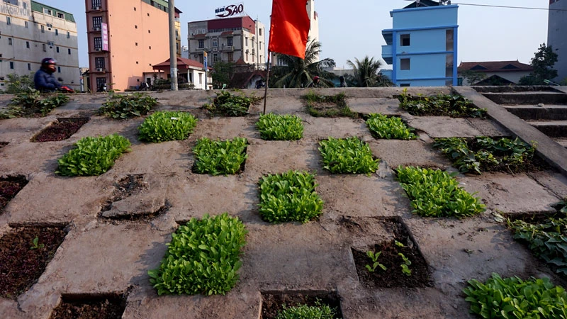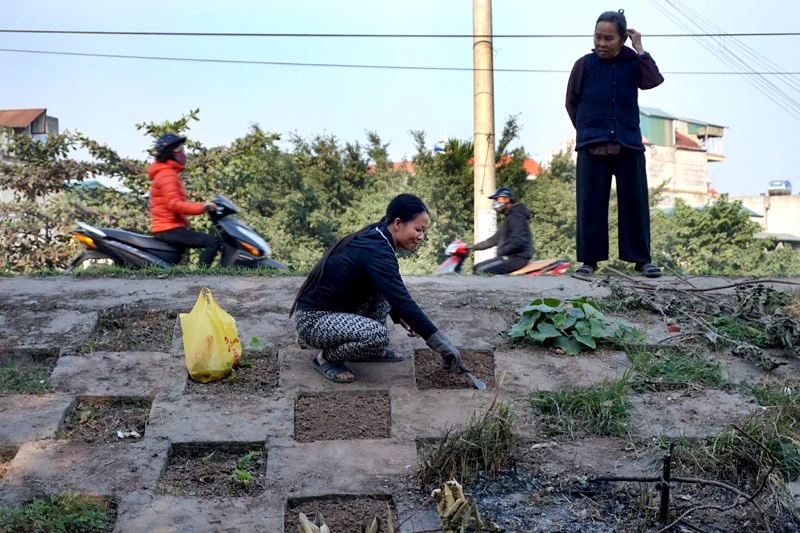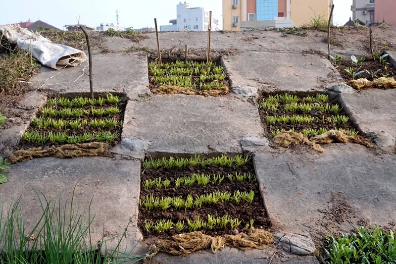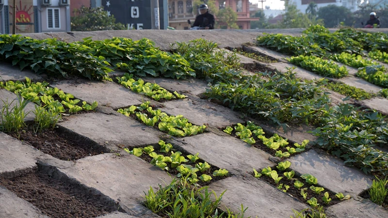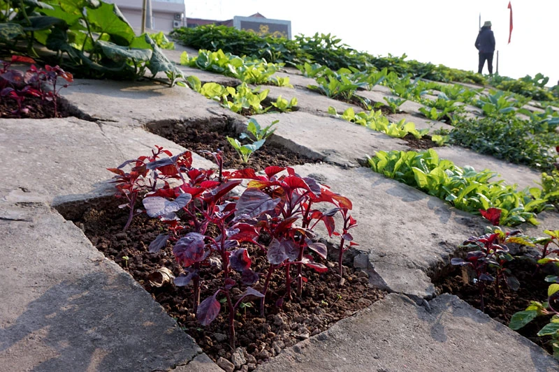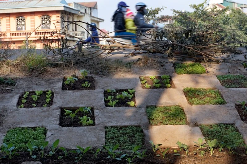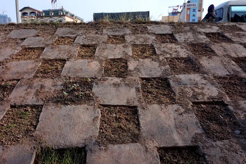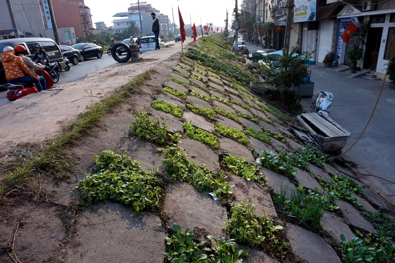Kè bê tông dọc theo triền đê trên phố Phú Viên, thuộc phường Bồ Đề được thiết kế có tác dụng chống sạt lở đất. Xen kẽ trên kè bê tông là những ô vuông trồng cỏ giữ đất, mỗi chiều chỉ 40 cm. Gần đây những ô cỏ này đã được một số người dân sống trong khu vực làm sạch cỏ và thay vào đó là những ô trồng rau, củ các loại.