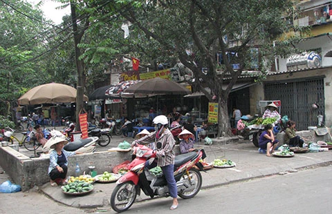 Sân chơi ở khu tập thể Thành Công (Hà Nội) bị biến thành nơi họp chợ, bán hàng ăn. (Ảnh chụp ngày 6-5) Ảnh: H.VÂN