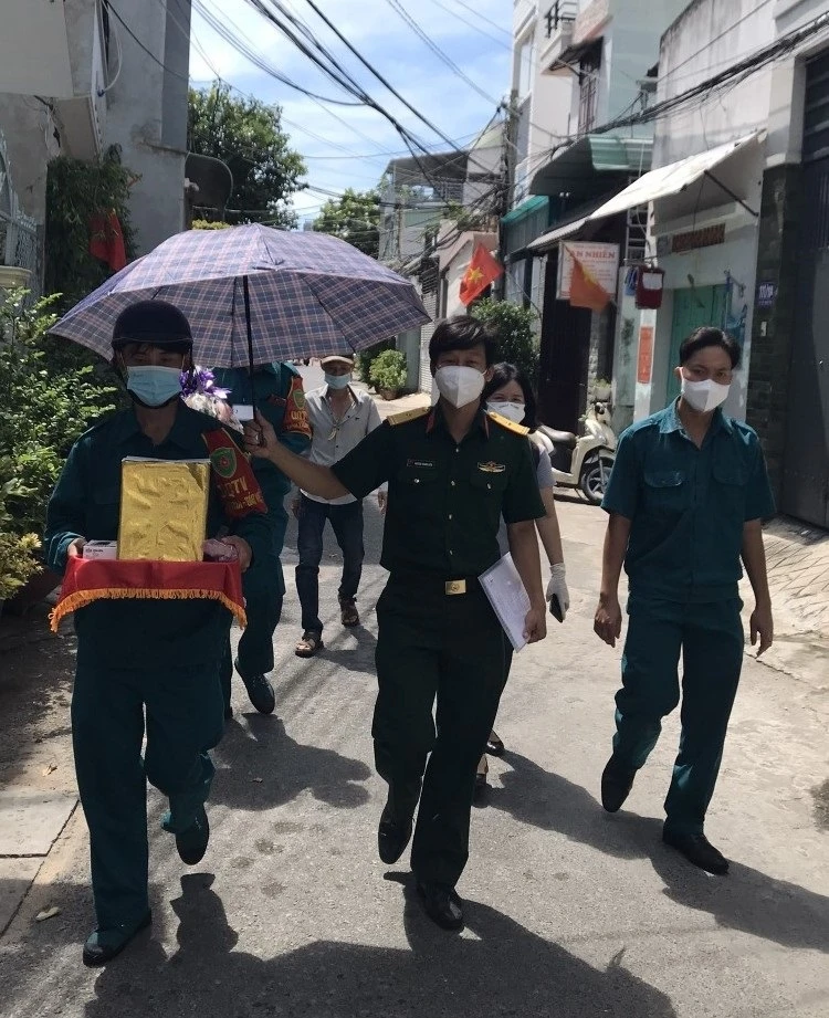 Trong dịch, thiếu tá Nguyễn Trung Kiên cùng với đơn vị được phân công làm nhiệm vụ trực chốt, phun xịt khử khuẩn các điểm quanh TP Thủ Đức và hỗ trợ đưa tro cốt người dân mất vì COVID-19 về nhà.