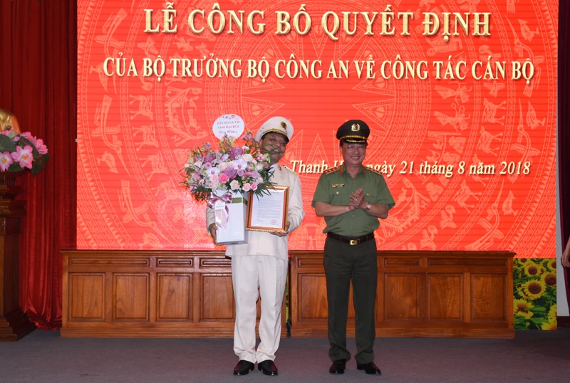 Thượng tướng Nguyễn Văn Thành, Ủy viên TW Đảng, Thứ trưởng Bộ Công an trao Quyết định bổ nhiệm Giám đốc Công an Thanh Hóa cho Thiếu tướng Nguyễn Hải Trung. Ảnh: Đ.HỢP