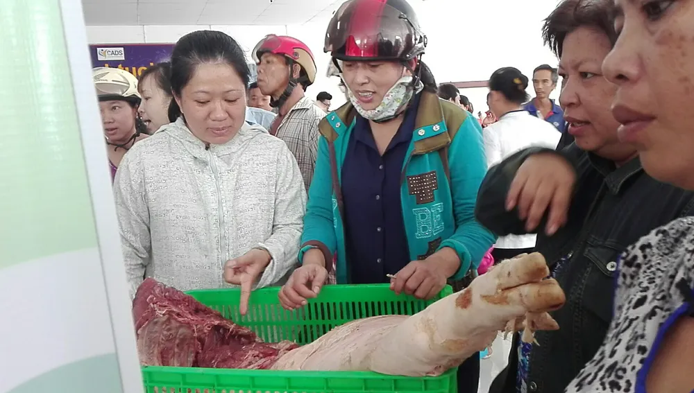 Tại đây, người dân sẽ được mua thịt heo sạch với giá 35.000-42.000 đồng/kg, rẻ hơn so với thị trường. Cầm trên tay hai bọc thịt heo lớn, bà Nguyễn Thị Nhung hồ hởi nói: “Chen lấn cả buổi sáng tôi mới mua được mớ thịt này nè. Thay vì mua thịt ở chợ, thịt ở đây bán rẻ hơn và an tâm về an toàn vệ sinh thực phẩm. Hơn nữa với tình hình người nuôi heo lỗ quá trời nên tôi cũng muốn góp chút sức giúp nông dân vượt qua khó khăn. Với chỗ thịt heo này, gia đình tôi ăn cả tuần, đỡ mất công đi chợ”.