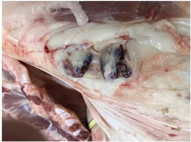Tại thời điểm kiểm tra, đội phát hiện hơn 620 kg thịt heo không có dấu kiểm soát giết mổ trên thân thịt. Chưa hết, đội còn ghi nhận các móng chân bị bong tróc, biểu hiện điển hình của bệnh lở mồm long móng.
