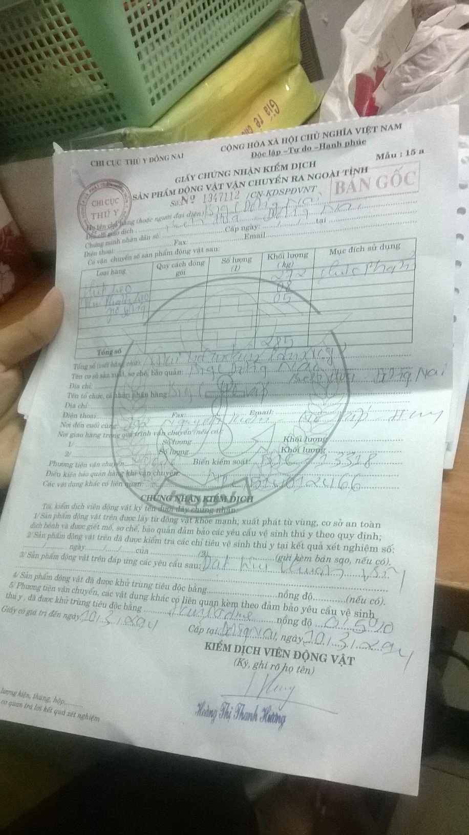 Giấy chứng nhận sản phẩm an toàn từ Chi cục Thú y Đồng Nai.