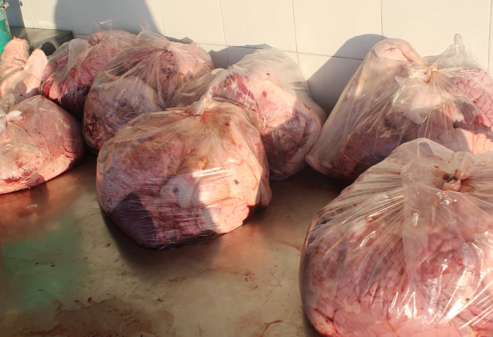 Số phụ phẩm heo thối được phát hiện kịp thời không đảm bảo vệ sinh an toàn thực phẩm. Ảnh: Thanh Tuyền