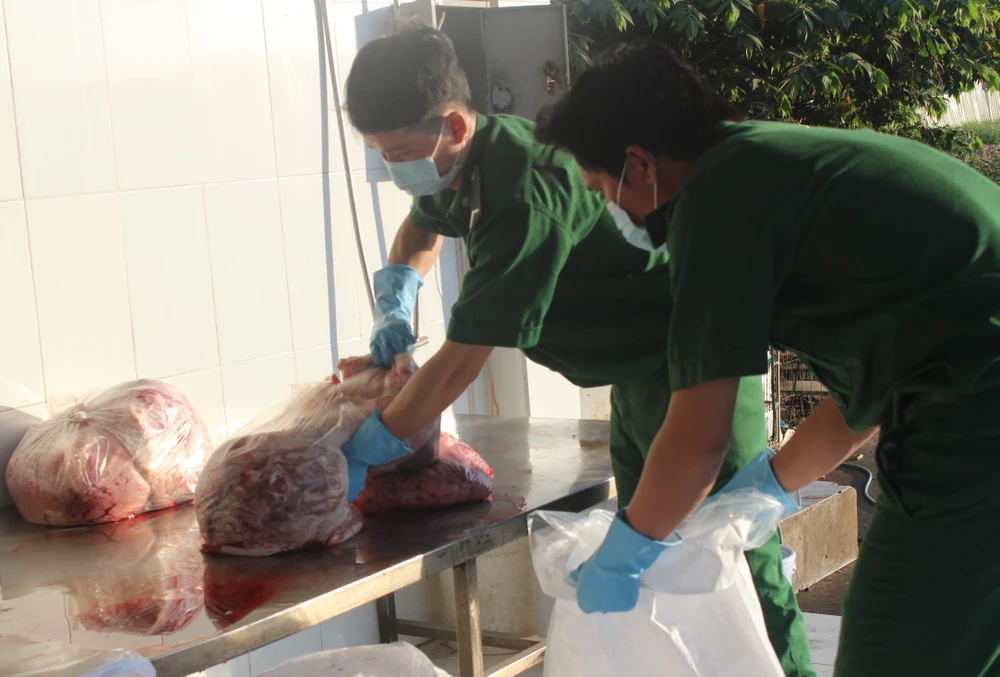 Nhân viên trạm kiểm dịch đang xử lí số phụ phẩm để mang đi tiêu hủy. Ảnh: Thanh Tuyền