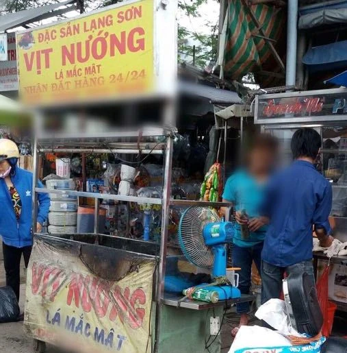 Theo ghi nhận của chúng tôi, cứ tầm 11 giờ trưa tại các khu chợ trên đường, những chiếc xe đẩy này được chủ hàng kéo ra và bắt đầu những mẻ nướng. Không hề có che chắn, những chú vịt quay vàng ươm hay hàng chục xiên thịt thơm phức cứ thế được chủ hàng treo lên những chiếc xe nướng đầy khói. Điều đáng nói ở đây, những người chế biến không hề sử dụng găng tay bảo hộ nào, các dụng cụ chế biến như thớt và dao được bày biện ngay cạnh lò nướng.