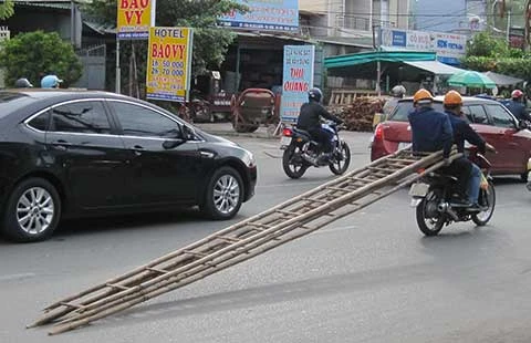 Thời gian gần đây, hình ảnh này diễn ra khá nhiều trên đường phố vì các công nhân phải đi tu sửa đường dây điện khi vào mùa mưa gió. Nói gì thì nói, kiểu di chuyển thang như thế này ẩn chứa nhiều nguy hiểm, có nguy cơ gây TNGT. Rất mong các công nhân điện phải có cách di chuyển thang an toàn hơn.