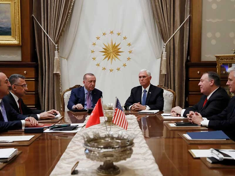 Tổng thống Thổ Nhĩ Kỳ Recep Tayyip Erdogan (trung tâm, trái) và Phó Tổng thống Mỹ Mike Pence (trung tâm, phải) trong cuộc gặp ở Ankara. Ảnh: AP