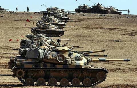 Hãng thông tấn Anadolu đưa tin chiến dịch “Lá chắn sông Euphrates” mở màn lúc 4 giờ sáng 24-8. Đầu tiên pháo binh và máy bay của Thổ Nhĩ Kỳ và liên minh oanh kích. Sau đó, 12 xe tăng Thổ Nhĩ Kỳ cùng lực lượng đặc nhiệm đã vượt biên giới tiến vào lãnh thổ Syria (ảnh).