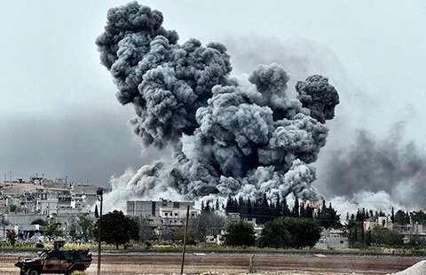 Chiến sự ở thị trấn vùng biên Kobane nhìn từ Thổ Nhĩ Kỳ. Ảnh: GETTY IMAGES