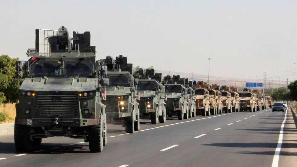 Đoàn xe quân sự di chuyển trên một tuyến đường ở Kilis, gần biên giới Thổ Nhĩ Kỳ - Syria hôm 9-10. Ảnh: REUTERS