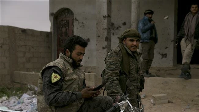 Các thành viên SDF bên ngoài TP Baghouz, Syria. Ảnh: AP