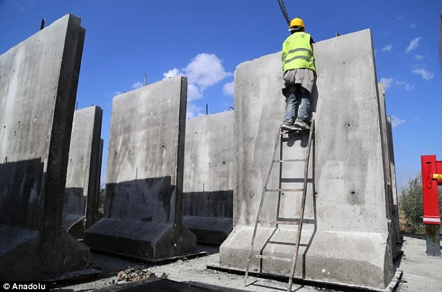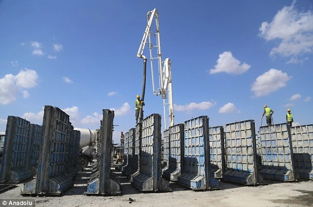 Thổ Nhĩ Kỳ đang xây một bức tường bê tông dài 500 dặm giữa biên giới nước này với Syria. (Nguồn: Daily Mail)