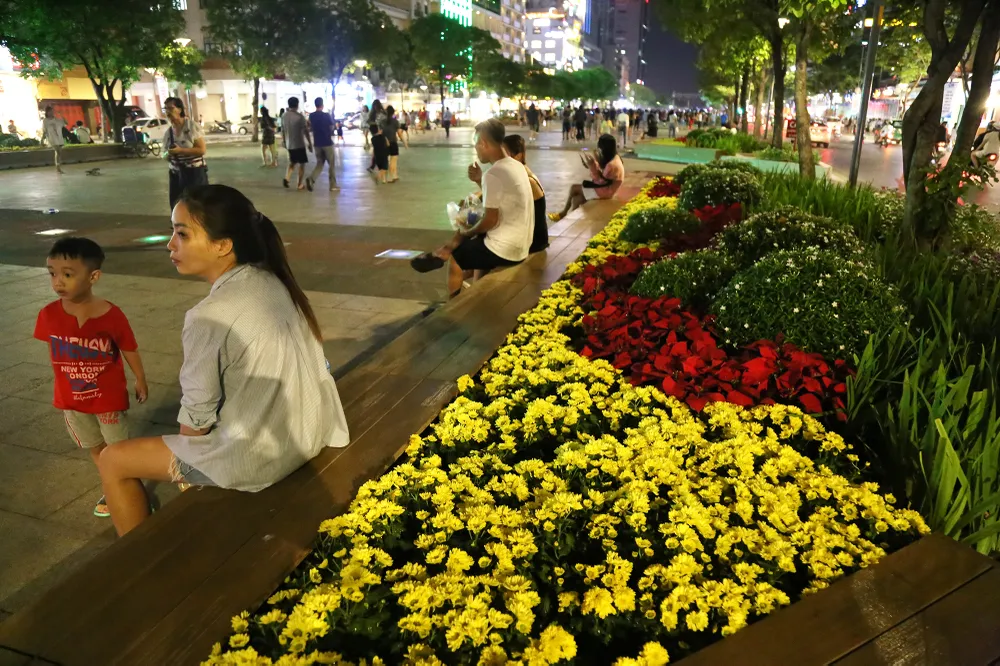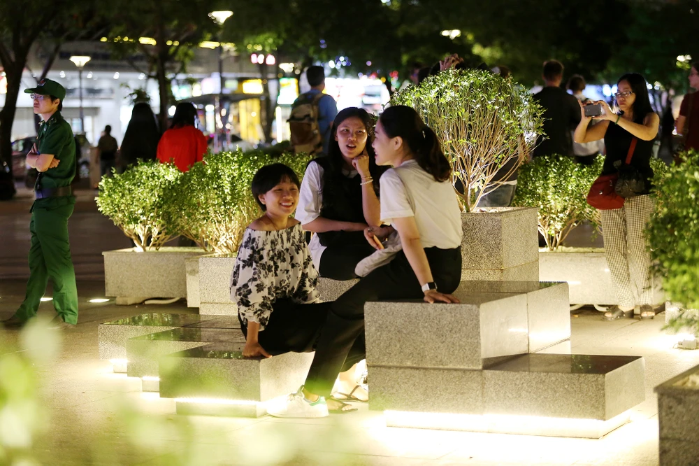 "Hôm nay xuống phố đi bộ thấy có đài phun nước với hình tượng hoa sen rất đẹp, bên cạnh đó còn có thêm ghế ngồi, bồn cây kết hợp hài hòa tạo một điểm nhấn khác biệt cho tuyến phố này" - chị Quỳnh (quận 1) chia sẻ.