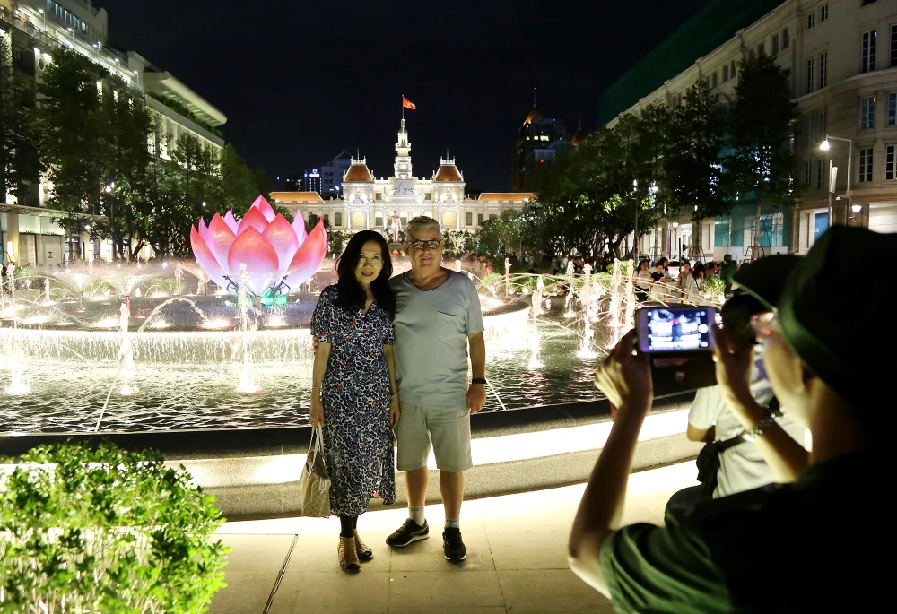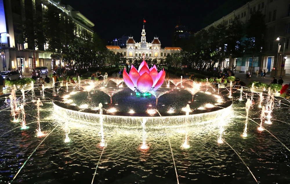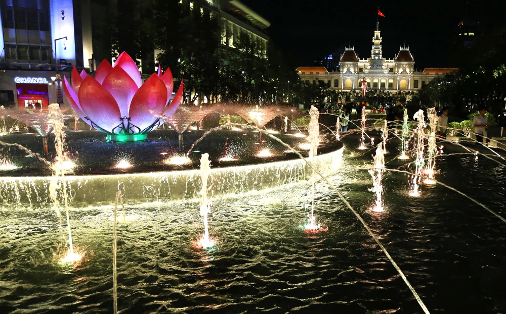 Tối 31-10, lãnh đạo TP.HCM và các sở, ngành đã nhấn nút, chính thức đưa công trình Đài phun nước nghệ thuật tại giao lộ Nguyễn Huệ và Lê Lợi vào hoạt động sau bốn tháng thi công.