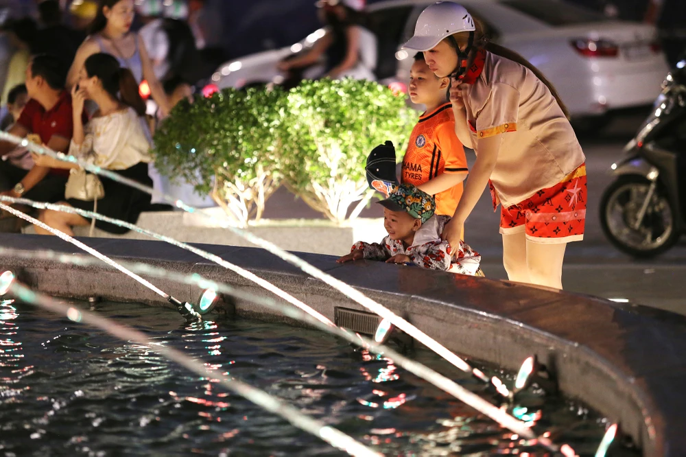 Người dân và du khách chụp chụp ảnh kỷ niệm trong ngày khánh thành đài phun nước nghệ thuật.
