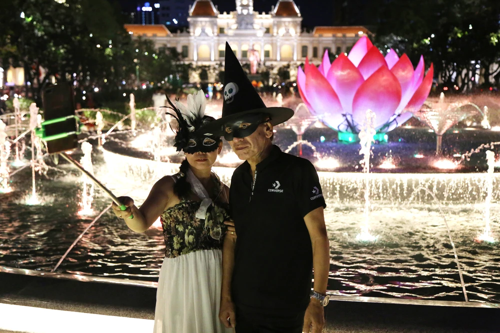 Người dân xuống phố chơi Halloween và chụp ảnh với công trình đài phun nước hoa sen.