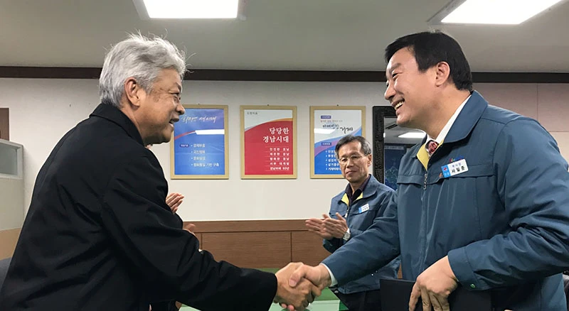 Chủ tịch VTF Trương Ngọc Để và Phó Thị trưởng Geoje Il-Jun Seo (phải) bắt tay chúc mừng bản hợp tác.