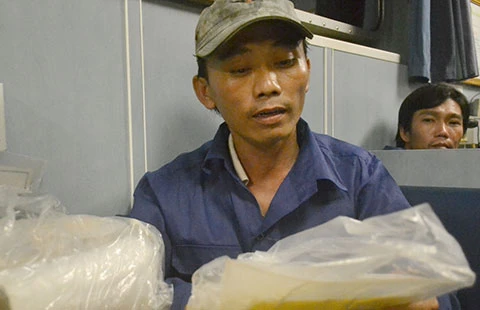 Thuyền trưởng Lẩy và bọc nylon đựng giấy tờ con tàu còn sót lại sau vụ tai nạn. Ảnh: Tấn Tài