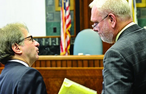 Ông Barry Scheck (trái), Giám đốc Dự án Giúp đỡ người vô tội, trao đổi với các công tố viên. Nguồn: AP