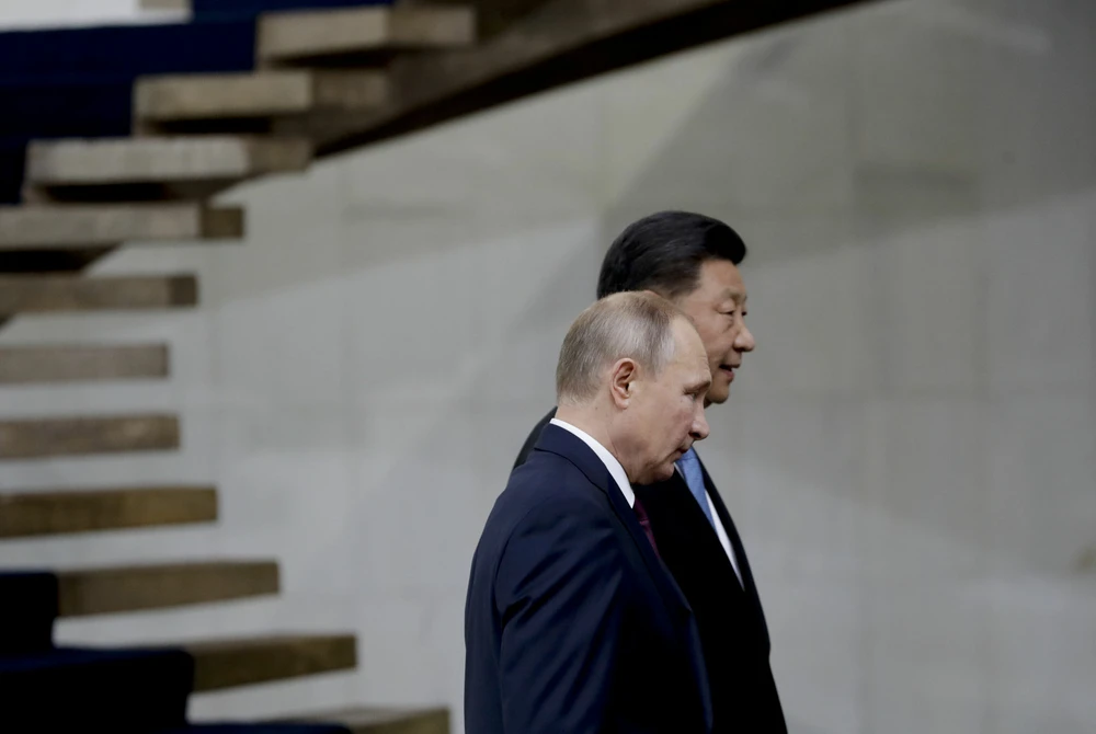 Tổng thống Nga Vladimir Putin và Chủ tịch Trung Quốc Tập Cận Bình đi dạo tại cung điện Itamaraty ở Brasilia, Brazil, ngày 14-11-2019. Ảnh: AP