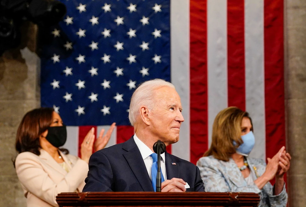 Tổng thống Mỹ Joe Biden phát biểu tại một phiên họp chung của Quốc hội, với Phó Tổng thống Kamala Harris và Chủ tịch Hạ viện Nancy Pelosi tại thủ đô Washington D.C., ngày 28-4. Ảnh: REUTERS