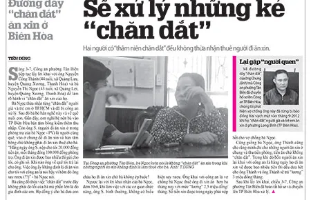 | Lên án kẻ ăn trên mồ hôi, nước mắt người khác Tôi không chấp nhận nạn “chăn dắt” ăn xin, càng không muốn có tình trạng ăn xin. Một người lành lặn, khỏe mạnh thì không thể viện bất cứ lý do gì để ăn trên mồ hôi, nước mắt, ăn trên lòng tự trọng của con người. Xã hội cần lên án thật gay gắt đối với những kẻ kiếm ăn trên những phận người như thế và phải có những hình thức xử lý thích hợp khi ta phanh phui ra được những đường dây này. NAM NGUYÊN |