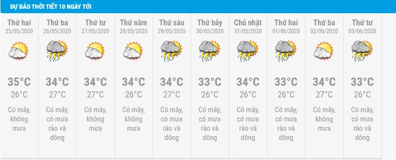 Nhiệt độ trung bình ở TP.HCM từ nay tới ngày 3-6 dao động 33-35 độ C. Nhiệt độ cao nhất 35 độ C sẽ rơi vào ngày 25-5. Cũng trong ngày 25-5, tuy nhiệt độ nắng nóng, có mây nhưng không mưa.