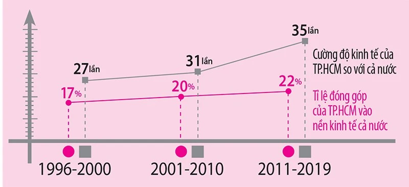 Thứ nhất, đóng góp của TP vào kinh tế cả nước không ngừng tăng: giai đoạn 1996 - 2000 kinh tế TP chiếm 17% kinh tế cả nước; giai đoạn 2001 - 2010 chiếm 20% và từ năm 2011 - 2019 luôn chiếm lớn hơn 22% kinh tế cả nước.