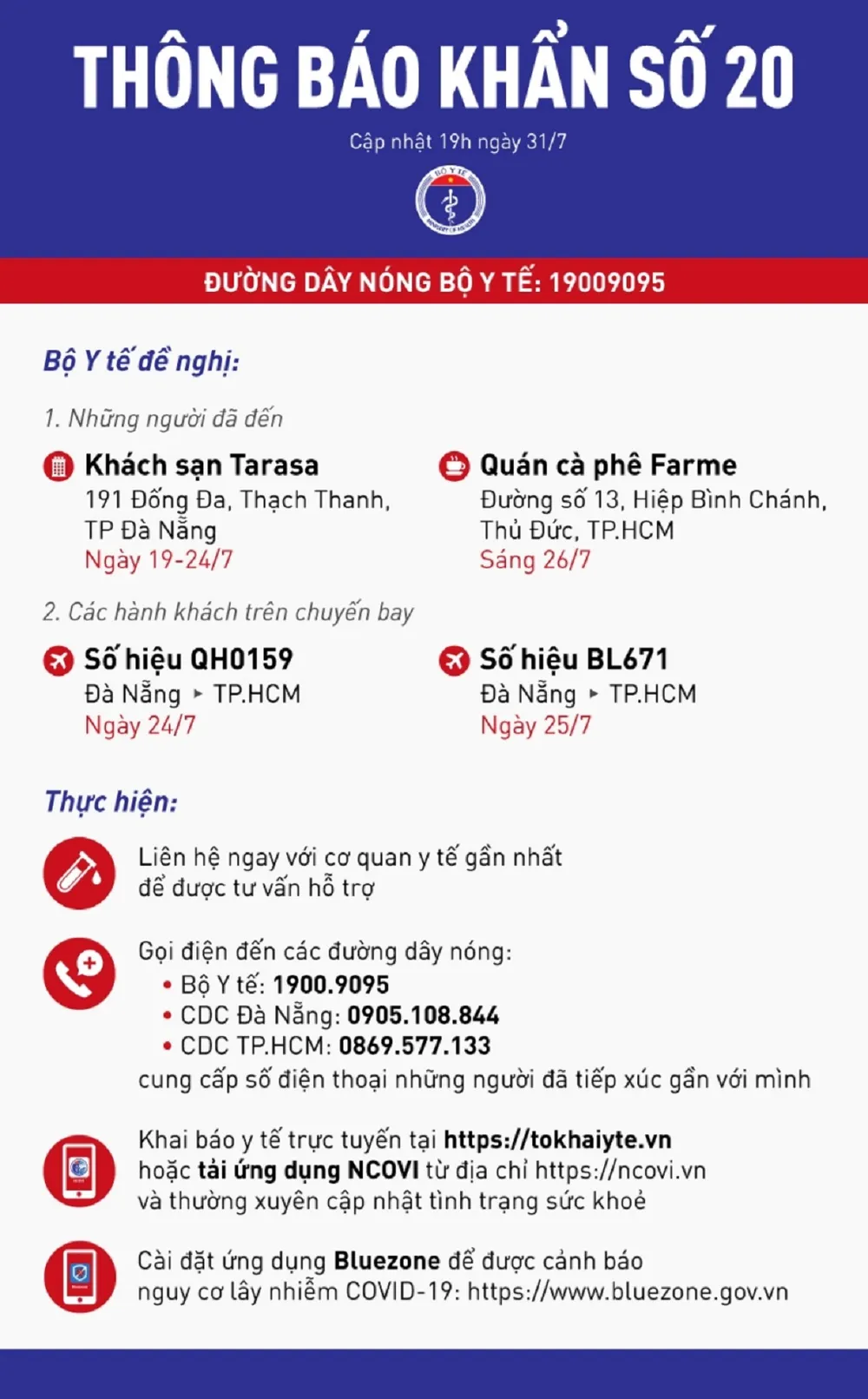 Theo đó, Bộ Y tế đề nghị những người đã đến khách sạn Tarasa - Đà Nẵng, quán cà phê Farme - TP.HCM, hành khách trên các chuyến bay QH0159 và BL671 từ Đà Nẵng đi TP.HCM khẩn trương liên hệ với cơ quan y tế gần nhất để được hỗ trợ.