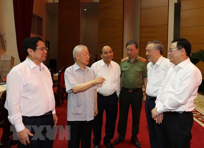 Tổng bí thư Nguyễn Phú Trọng và các lãnh đạo khác ở bàn chủ tọa hội nghị. Ảnh: TTXVN