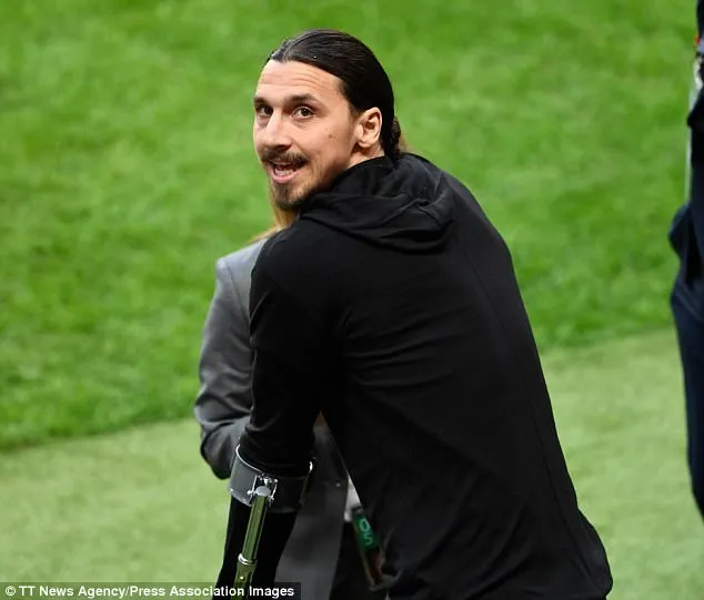 Ibrahimovic mang nạng cổ vũ MU trong trận chung kết Europa League thắng Ajax 2-0.