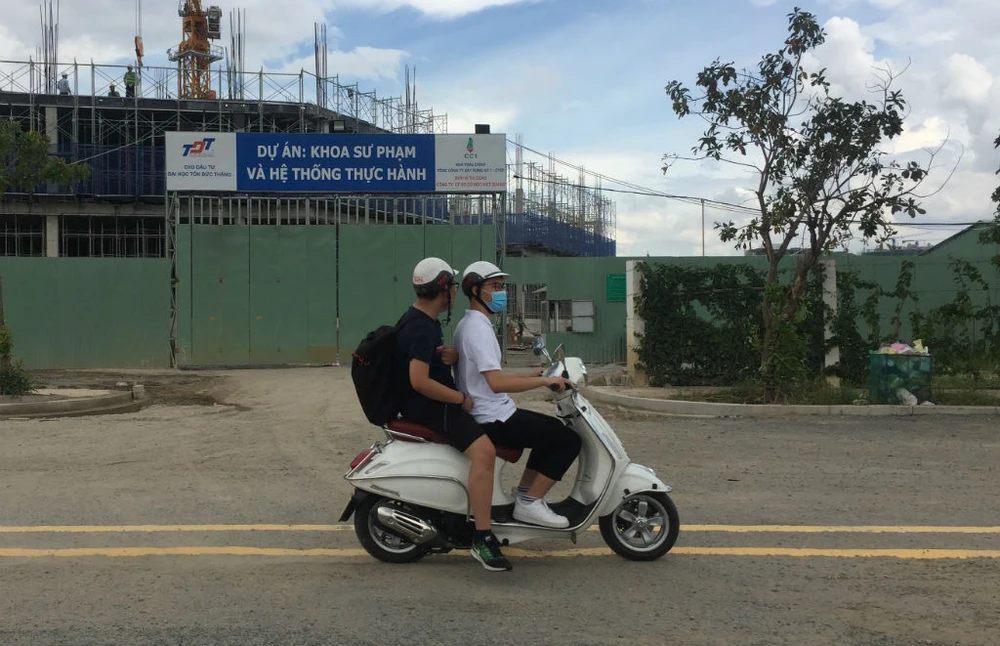 Ngay khi công trình cầu, đường đang được xây dựng, các trường đại học có mặt sau nằm hướng ra tuyến D1 đã khẩn trương xây dựng các hạng mục và cổng xoay ra hướng này. Đây cũng là giải pháp thêm hướng đường tiếp cận của các trường để giảm tải, tránh ùn tắc cho phía mặt tiền đường Nguyễn Hữu Thọ, Nguyễn Văn Linh. Trong ảnh: Trường ĐH Tôn Đức Thắng khẩn trương xây dựng cổng sau và văn phòng khoa Sư phạm, hệ thống thực hành ở phía đường D1, hướng ra mặt sông Rạch Ông, nơi có các công trình công cộng, giải trí như đường đi bộ, bờ kè ven sông, vườn hoa, cây xanh, cảnh quan...
