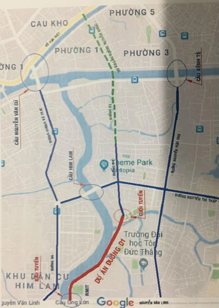 Bình đồ đường D1 và cầu đường Nguyễn Khoái sẽ khởi công xây dựng trong năm 2019. Đường vạch màu đỏ liền mạch là đường D1 mới; đường màu xanh nước biển là đường D1 đã và đang xây dựng, chạy giữa khu dân cư cao cấp Him Lam (quận 7); đường xanh lá cây đứt đoạn là cầu và đường Nguyễn Khoái sẽ khởi công trong năm 2019.