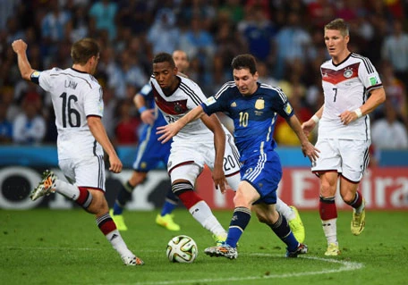 Messi trong vòng vay của các hậu vệ Đức ở trận chung kết World Cup 2014.