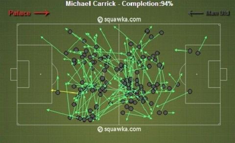 Còn theo thống kê của Squawka, ở trận đấu với Crystal Palace, Carrick có tỉ lệ chuyền bóng chính xác là 94%. Những đường chuyền của Carrick góp phần quan trọng giúp Man United kiểm soát bóng nhiều hơn Crystal Palace. Đội bóng áo đỏ có tỉ lệ cầm bóng là 60% ở cuộc đụng độ đó.
