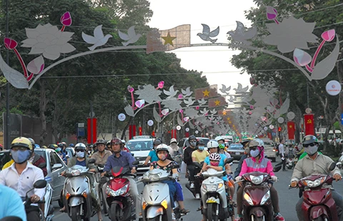 Đường Lê Duẩn, TP.HCM được trang hoàng chào mừng những ngày lễ. (Ảnh chụp chiều 29-4) Ảnh: HTD