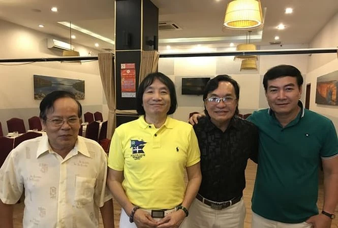 Nghệ sĩ Giang Châu, Minh Vương, Thanh Tuấn và Bảo Anh trong một buổi tụ tập cà phê.