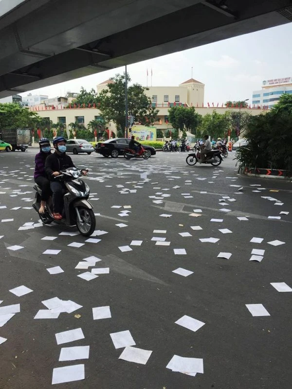 Nhiều lá đơn viết tay được rải đầy tại giao lộ Lý Thái Tổ - Nguyễn Tri Phương - Ba Tháng Hai (quận 10, TP.HCM). (Ảnh: Facebook)