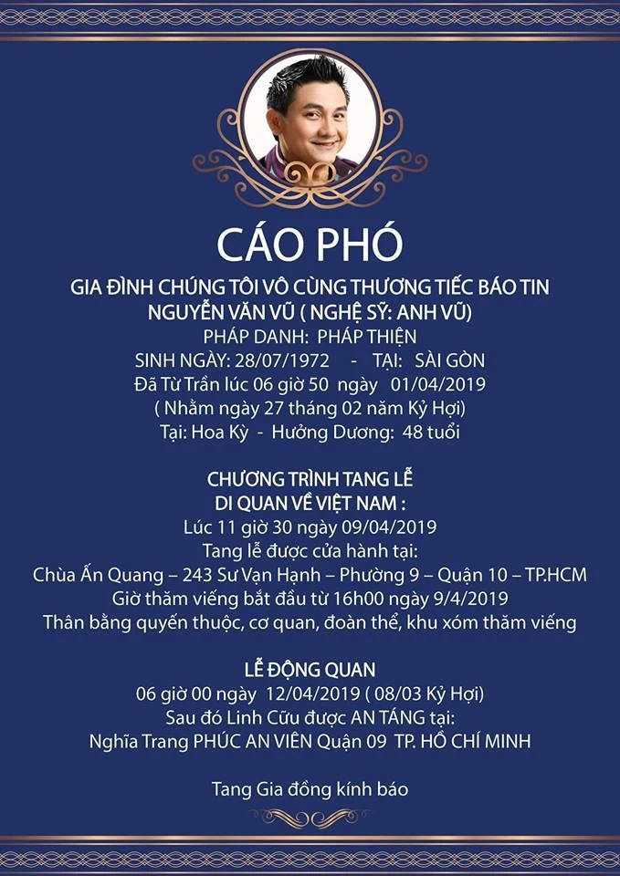 Cáo phó đám tang nghệ sĩ Anh Vũ vừa được công bố.