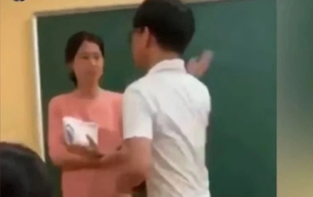 Lúc này, học sinh ĐNNK đi từ cuối lớp lên văng tục với cô, tự ý lấy lại tai nghe trên bàn giáo viên, rồi quay ra tát cô giáo.