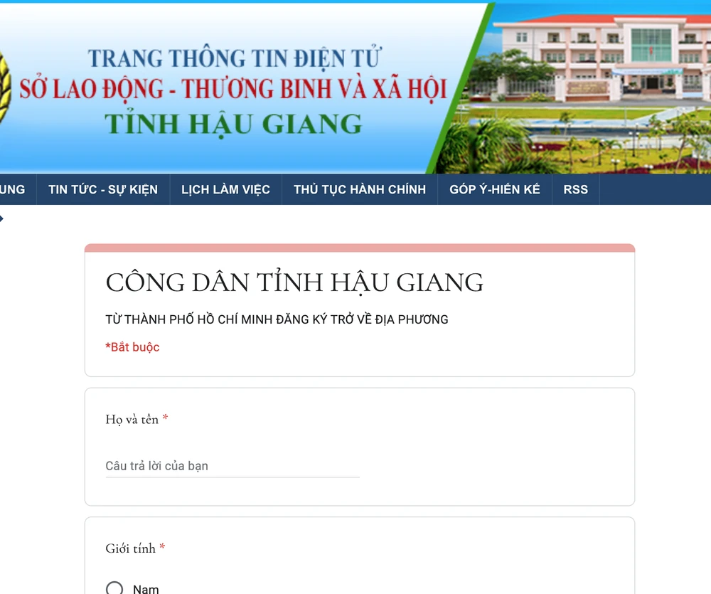 Trang đăng ký đưa người dân về quê của tỉnh Hậu Giang. Ảnh: ĐẶNG LÊ