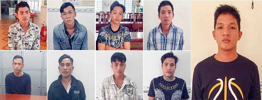 Chín đối tượng đang bị tạm giữ gồm: Trần Tuấn Thanh (27 tuổi, ngụ huyện Phong Điền, TP Cần Thơ), Chung Tấn Tuấn (tự là Tuấn Trấu, 25 tuổi), Danh Luận (24 tuổi), Trần Văn Nam (28 tuổi), Trần Thanh Việt (26 tuổi), Liêu Hoàng Tuấn (tự là Tuấn Đen, 23 tuổi), Trần Văn Thảnh (29 tuổi), Trần Văn Tài (31 tuổi) và Danh Bé An (24 tuổi) cùng ngụ tỉnh Kiên Giang.